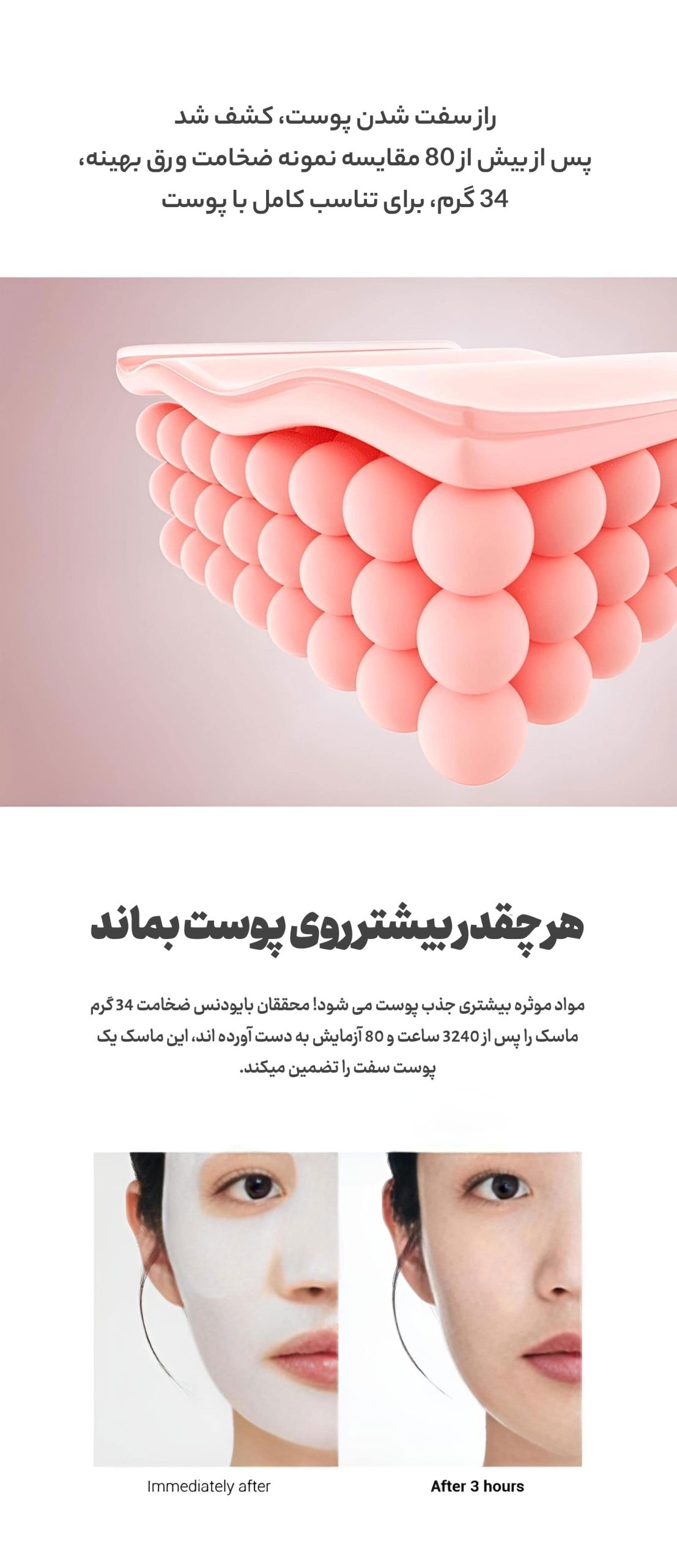 این ماسک حاوی 34 گرم عصاره میباشد که به عمق پوست نفوذ کرده و تبدیل به هیدروژل شفاف میشود که همپون یک فیلر عمل میکند.