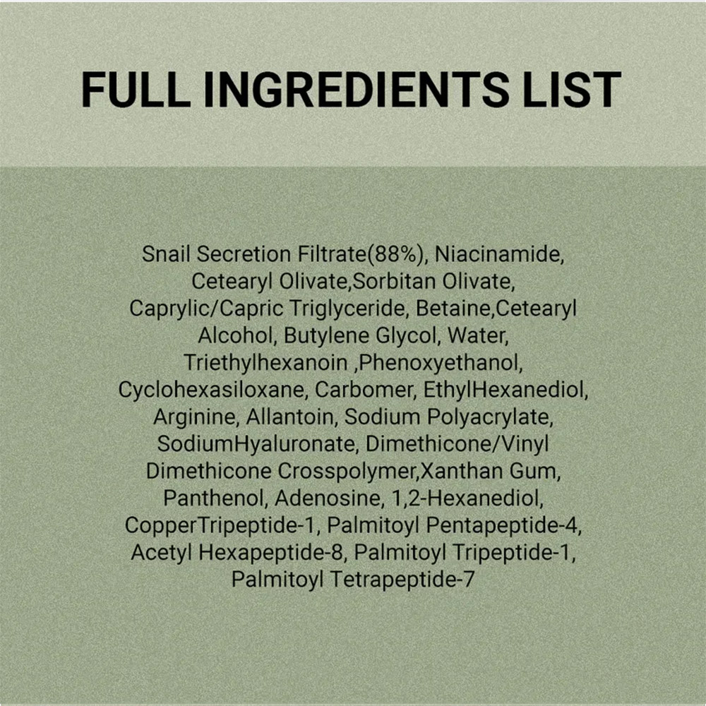 - ۸۸% موسین حلزون: ترمیم و بازسازی، آبرسانی، تسکین پوست و ضدپیری