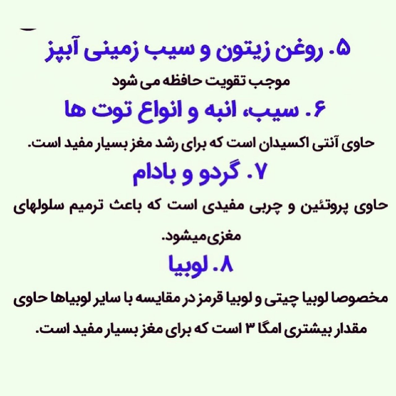.٨ لوبيا :مخصوصا لوبیا چیتی و لوبیا قرمز در مقایسه با سایر لوبیاها حاوی مقدار بیشتری امگا ۳ است که برای مغز بسیار مفید است.