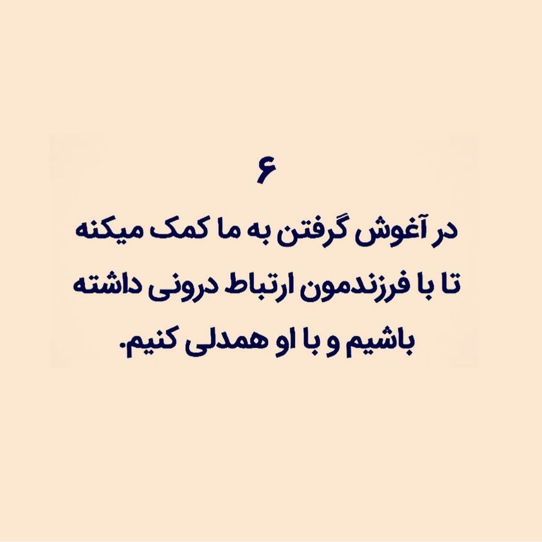 وقتی فرزندانمان را به آغوش میکشیم ، زمان برای آن لحظه متوقف می شود ، یک آغوش اجازه می دهد تا ما در لحظه حضور داشته باشیم؛ این ما را به احساس روحی و فیزیولوژیکی متصل می کند و با این آگاهی، به ما کمک می کند تا کمی بهتر با یکدیگر همدلی داشته باشیم.